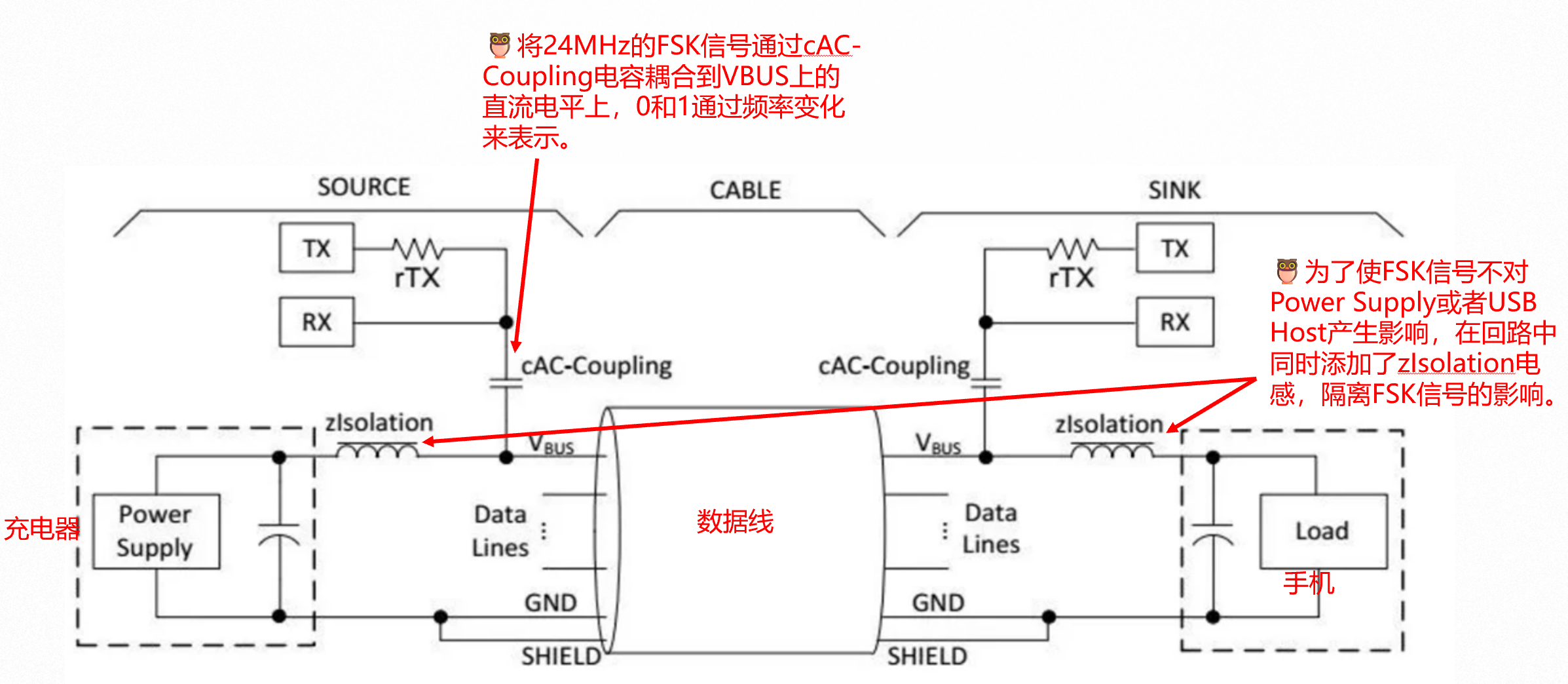 在PD协议出现之前,USB接口的供电能力非常有限,即使是BC1.2-DCP,也只能提供最大7.5W(5V/1.5A )的功率。那时USB接口绝大多数还是Type-A与Type-B,非Type-C,因而只有VBUS、D+、D-、GND线可供使用。 USB-IF想提升功率,但苦于没有通信线可用。某一天突发奇想:利用VBUS和GND,将PD协议的消息调制成24MHz的FSK信号,然后耦合到VBUS线,通过高频载波的形式进行信息传输,接收端收到波形时则对信号进行解调。 这便是PD1.0的核心精髓,和电力线载波通信有异曲同工…