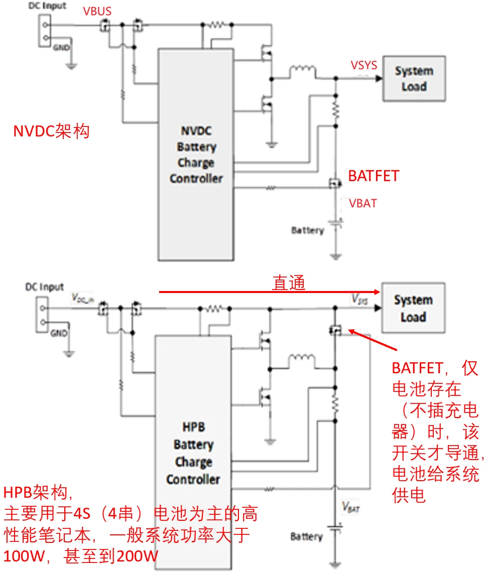 在技术领域,架构的设计通常更具思想性,更能展现人类的智慧,诠释了想象力比知识更为重要,知识是基础,但脑洞才是引擎! 手机上的NVDC架构和高性能笔记本上的HPB架构,是两种截然不同的路径管理方案,选择NVDC还是HPB,要在设计之初根据其市场定位和核心诉求做出抉择。 手机偏爱NVDC,因为NVDC在能效、成本和体积上找到完美平衡。 但对于不惜一切代价追求巅峰性能的高性能笔记本,HPB是必不可少的基石。它通过更复杂、更昂贵的架构,释放更为强大的功率。 两者的示意图如下图: HPB,Hybrid Power boost…