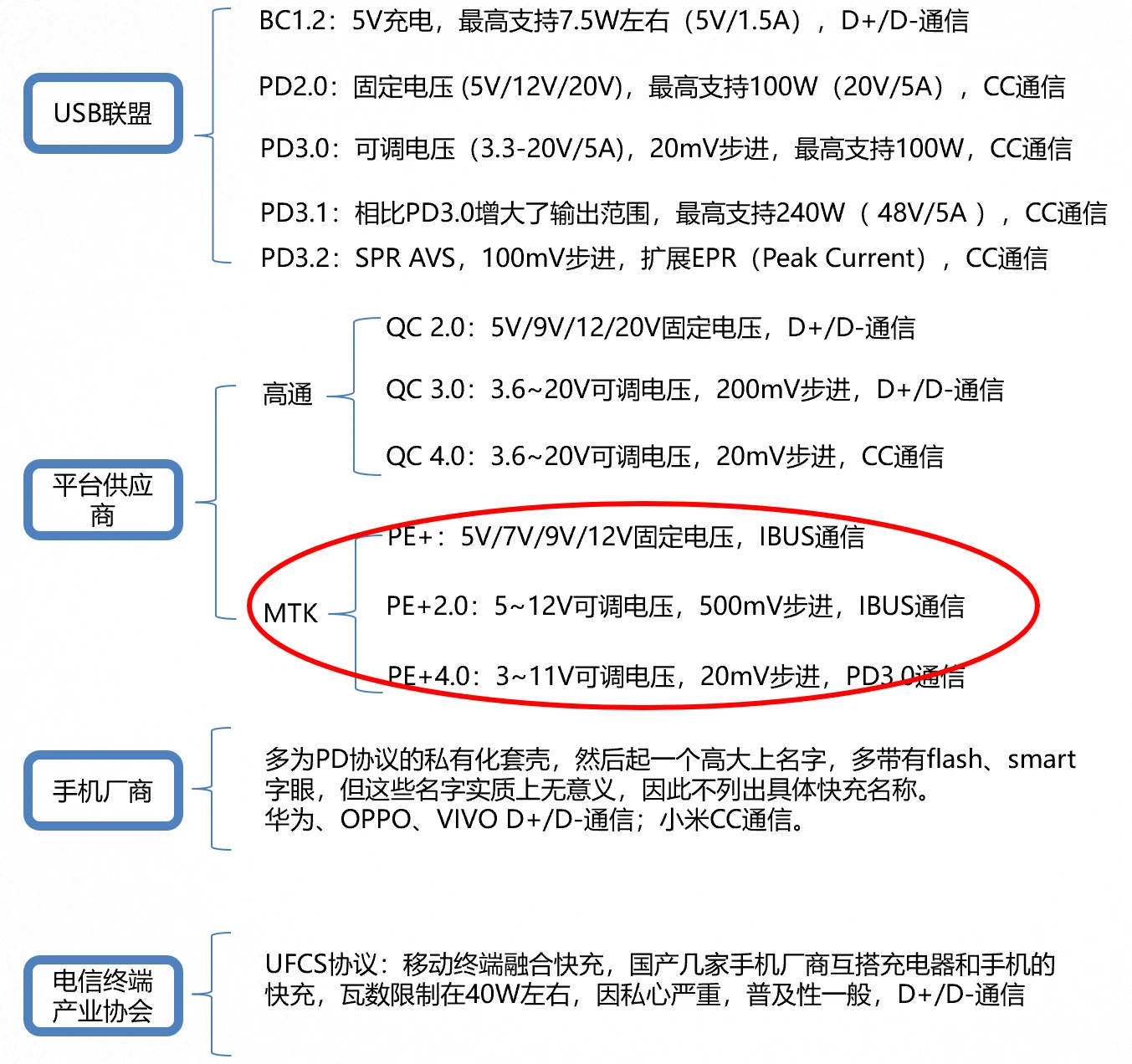 蛇化为龙,不变其文;家化为国,不变其姓。大丈夫当时富贵,百恶灭除,光耀荣华,贫贱之时何足累之哉! 在PD协议出现之前,USB接口的供电能力非常有限,即使是BC1.2-DCP,也只能提供最大7.5W(5V/1.5A )的功率,像老牛拉车一样慢。 此外那时USB接口绝大多数还是Type-A、Type-B,非Type-C的天下。因而想把充电器端的信息传递到手机,只有VBUS、D+、D-、GND线可供使用。 巧妇难为无米之炊,USB-IF想提升功率,但苦于没有通信线可用。某一天突发奇想:能否间接传输PD信号,具体地说,将P…