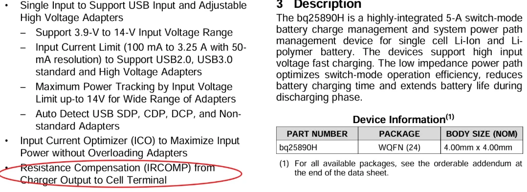 在阅读Buck充电IC datasheet时,通常能看到IRCOMP字样,以TI的BQ25890H举例如下图,这其实是一种工程实践上对充电时长的优化。 充电是基于具体的物理实体,而物理世界从来不是纯洁无瑕的,不可避免地存在各种寄生参数。比如走线,那就不可避免的存在阻抗。小电流充电时可能不需过多考虑,但在大功率充电场景下,便不可不察了。 为了优化走线阻抗对充电时长的影响,手机上的充电芯片上发展出了IR压降补偿功能。 如下图,充电IC的输出到电芯的路径上横亘着各种各样的阻抗,像是公司里面擅长各种摸鱼的同事一般,包括但不…