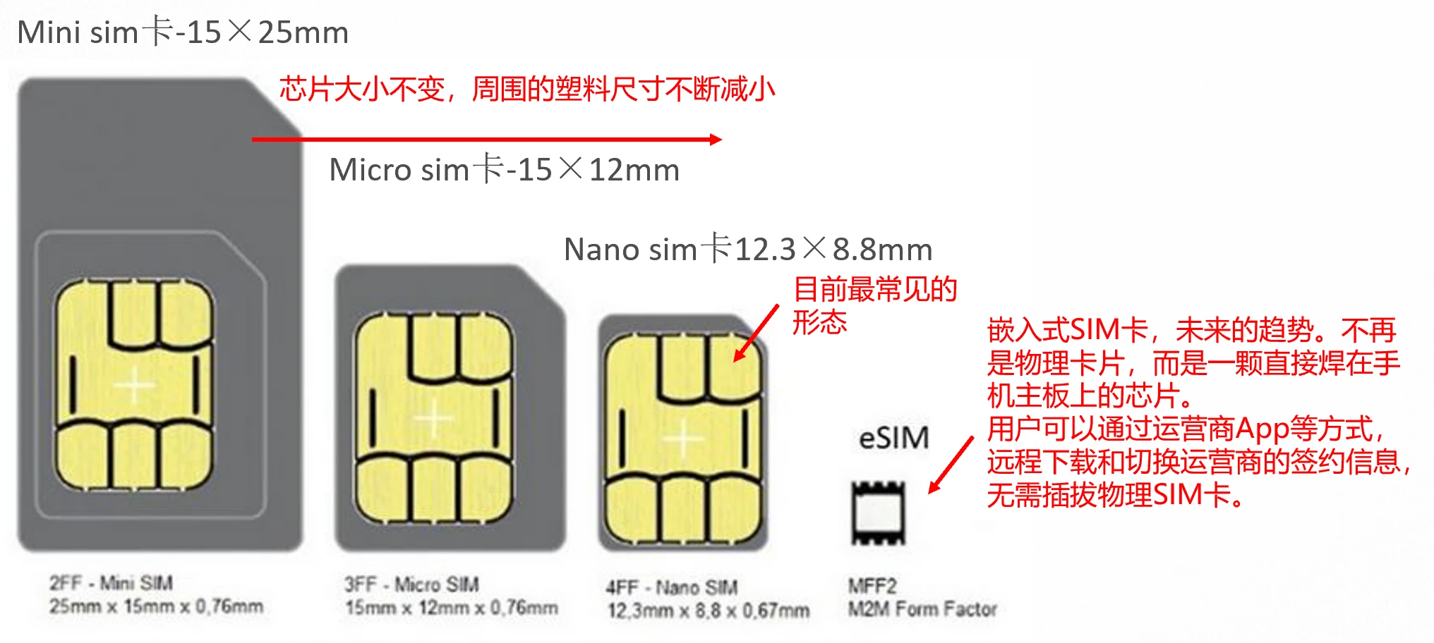 SIM的全称是Subscriber Identity Module,用户识别模块,也称为智能卡(UICC,高通就把SIM卡称为UICC卡)。 它的接口和协议符合ISO/IEC 7816(国标GB/T16649)标准,它的物理实体是一个封装在PVC卡片上的集成电路。 随着手机的发展,SIM卡的尺寸越变越小。 SIM卡的本质就是一张包含CPU和存储器的智能安全芯片,它就是你的个人网络身份证和安全密钥(防止被窃听),让移动网络(如中国移动、联通、电信)能够识别“你是你”,并允许你接入网络进行通话、发短信和上网。 拆开SI…