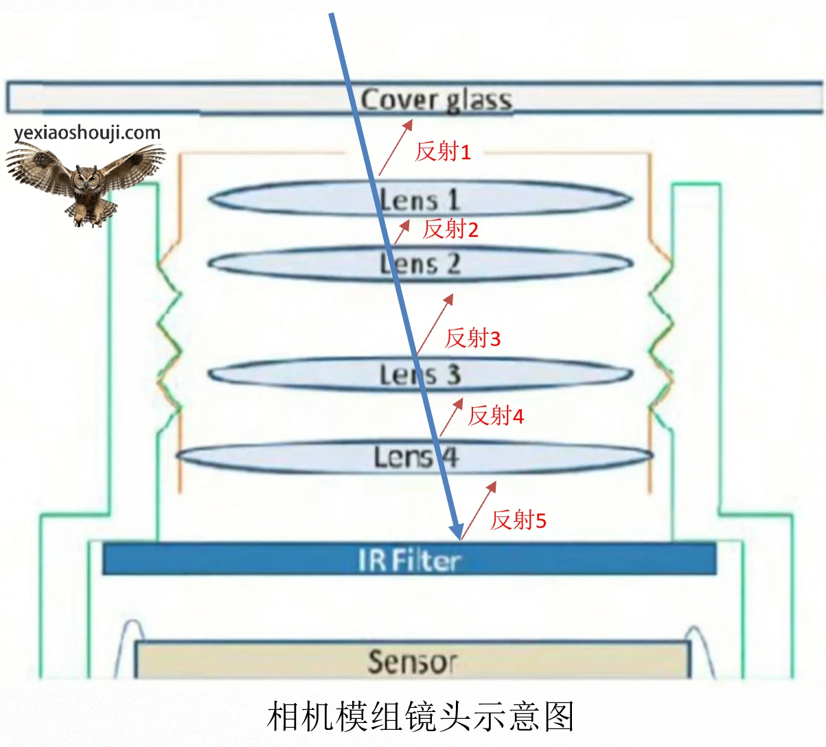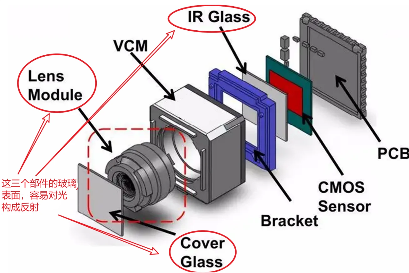 1)cover glass(保护玻璃)和lens(镜片)之间的反射,这种反射是手机camera成像鬼影最常见的现象,解决该种反射通常的方案是改善增透膜,减少反射的发生。