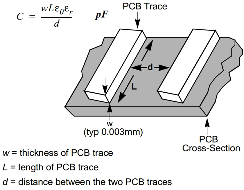 如下图所示,两条走线之间的电容值主要取决于走线之间的距离(d)和两条走线平行的距离(L),进入高阻抗走线的电流量等于: