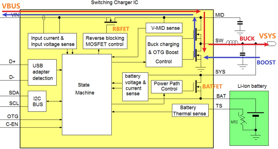 手机内部BUCK充电电路反过来看就是一个BOOST电路,该BOOST电路可把电池电压升到5V,然后通过VBUS送出去,电路示意图如下图,OTG 5V路径见蓝色。