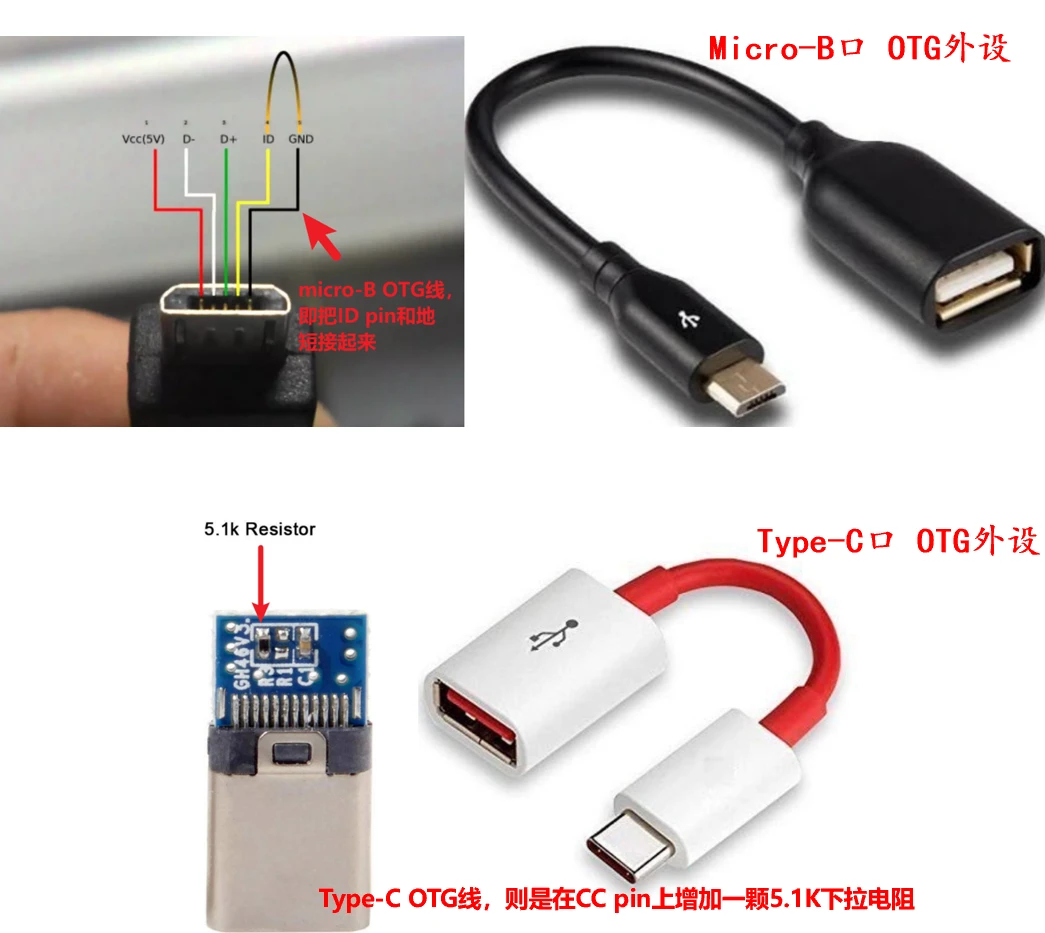 如果是Type-C口外设,则在CC pin上增加一颗5.1K下拉电阻即可,这样外设的角色就被定义为UFP。此时连接到手机上,手机就会作为DFP,并且OTG boost出5V给外设供电。