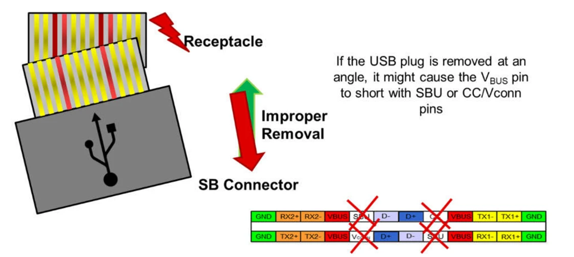 由Type-C规范定义,CC、SBU引脚和VBUS相邻,而最新的USB-PD规范中,VBUS电压范围可以是5~48V。在不当的插拔(机械扭曲,插拔的磨损,连接器制造公差),或者碎屑(导电碎屑)和湿气积聚,则存在VBUS短路到CC和SBU引脚的可能性。一旦短路,对下游器件来说就是过压灾难,晴天霹雳,可能导致手机功能异常或变砖。