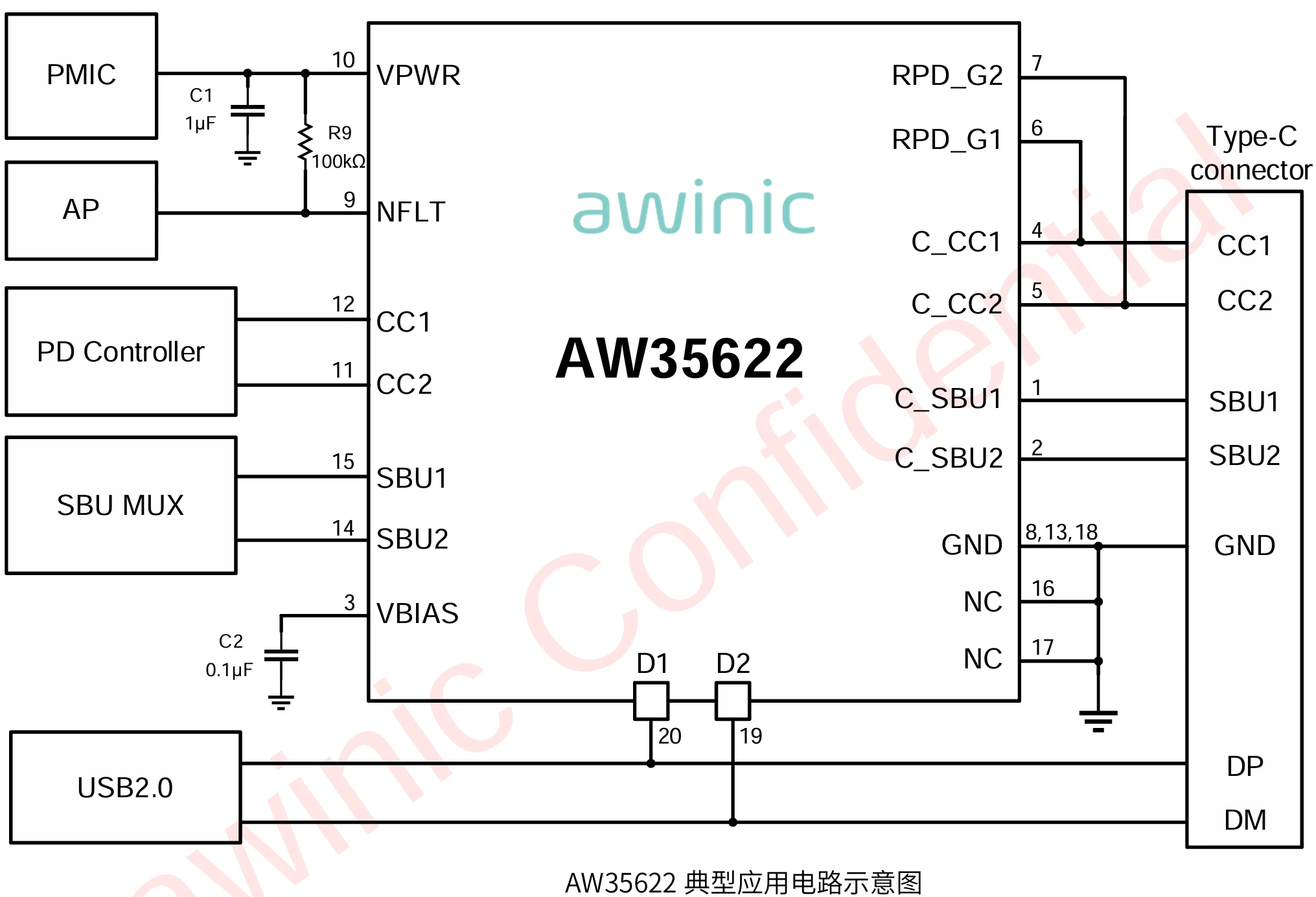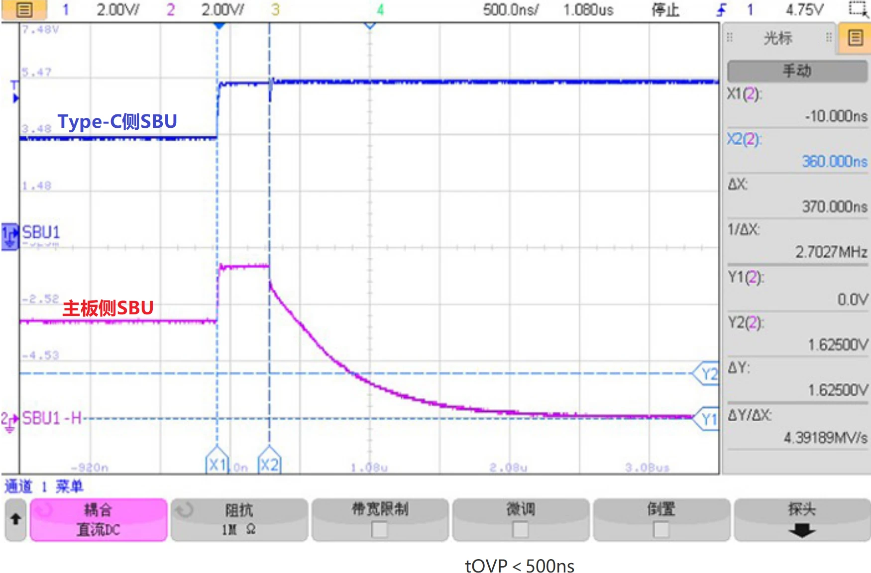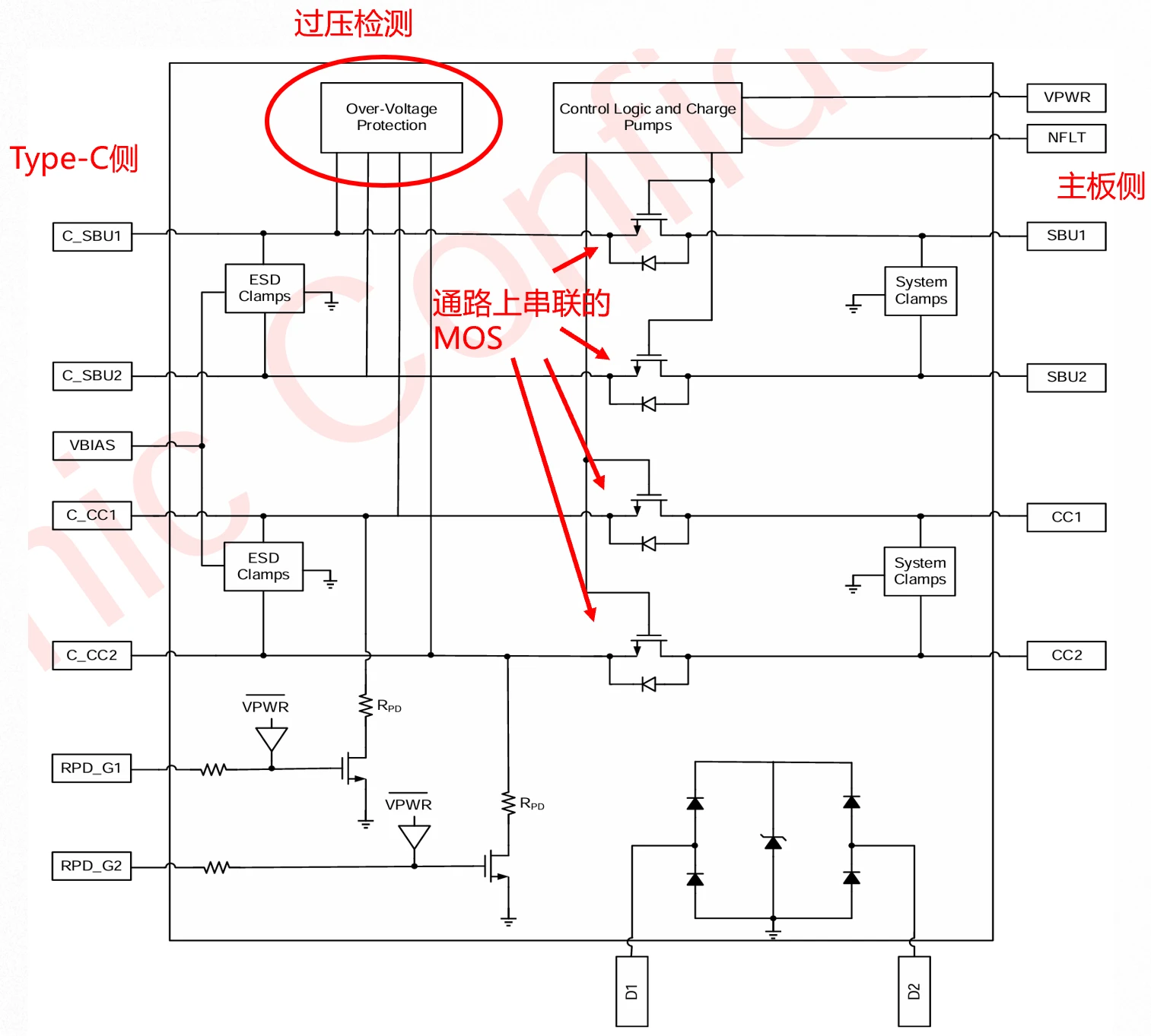 以艾为的AW35622为例,在CC和SBU引脚上设计了过压保护开关,芯片内部集成了高压MOS,串联放置在SBU和CC线上。当线路上检测到高于OVP阈值的电压时,MOS断开,从而将后端的部分与连接器上存在的高压状态隔离开来。