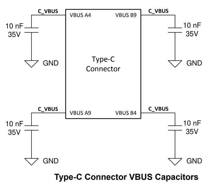 工程实践方面,除了VBUS母线电容1~10uF容值设计,Type-C连接器侧的4个VBUS pin也可对应放置nF级的电容。