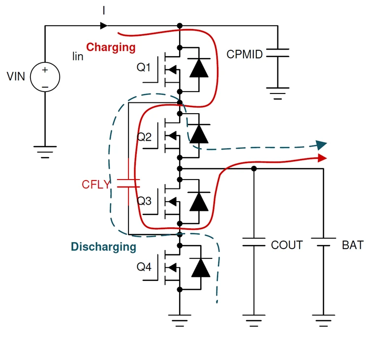 PHASE2:Q2和Q4导通,其他关断,Cfly和VBAT并联,电压变得相等,Vcfly = Vbat。