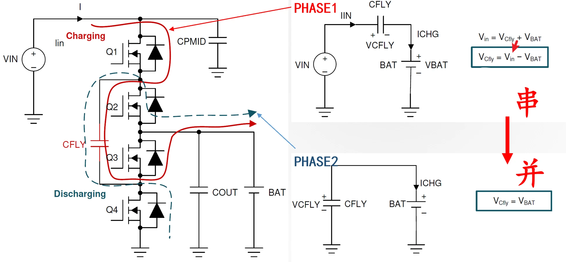 PHASE1:Q1和Q3导通,其他关断,VBAT和Vcfly串联,Vin = Vcfly + Vbat;