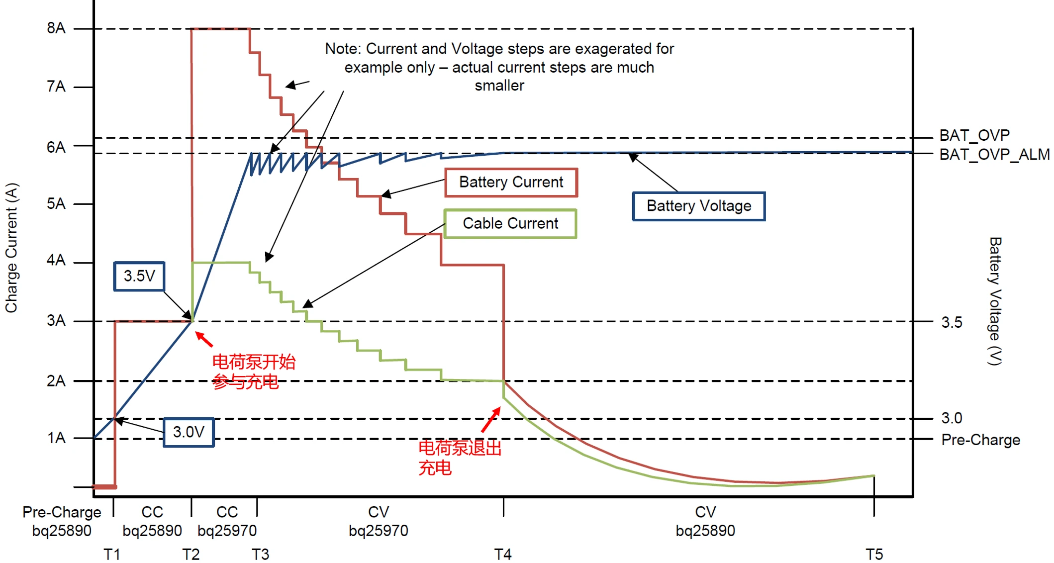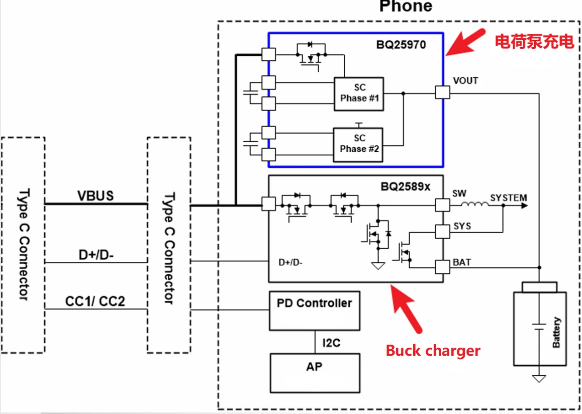 如下图,在电池的涓流充电和预充过程中,充电由buck充电IC控制。当电池电压达到3.5V时,手机向充电器申请电压,使能BQ25970电荷泵充电,通过微调VBUS的方式调节充电电流。