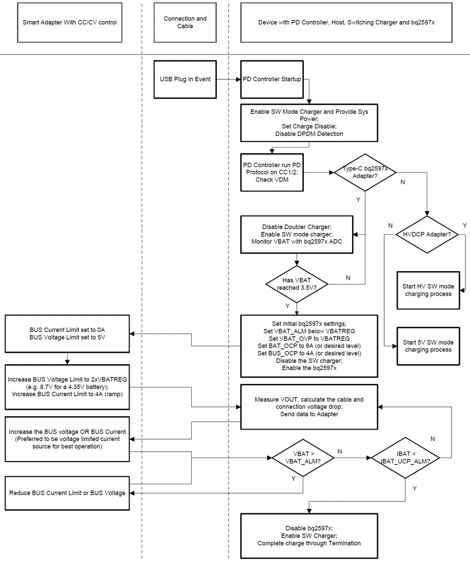 在CC阶段,手机会根据电池需求告诉充电器增减电流(如果电压超标,立马禁用输出)。一旦达到CV点,bq25970将向适配器提供反馈以减小电流,直到buck charger再次接管。