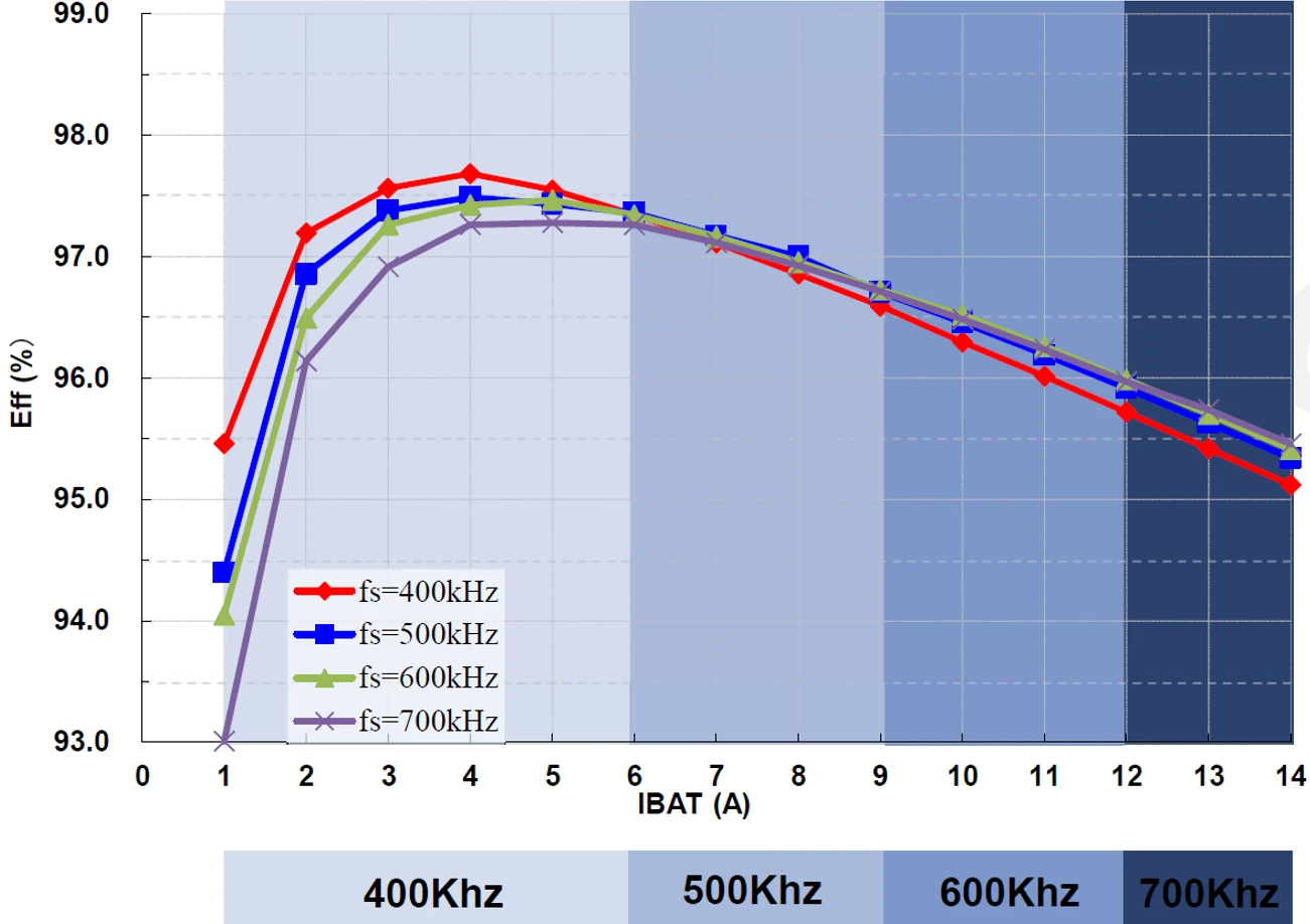 手机电荷泵的效率与开关频率之间存在着一种权衡(Trade-off) 的关系。如下图,随着开关频率的增加,电荷泵的整体效率逐渐达到最优,然后会下降。