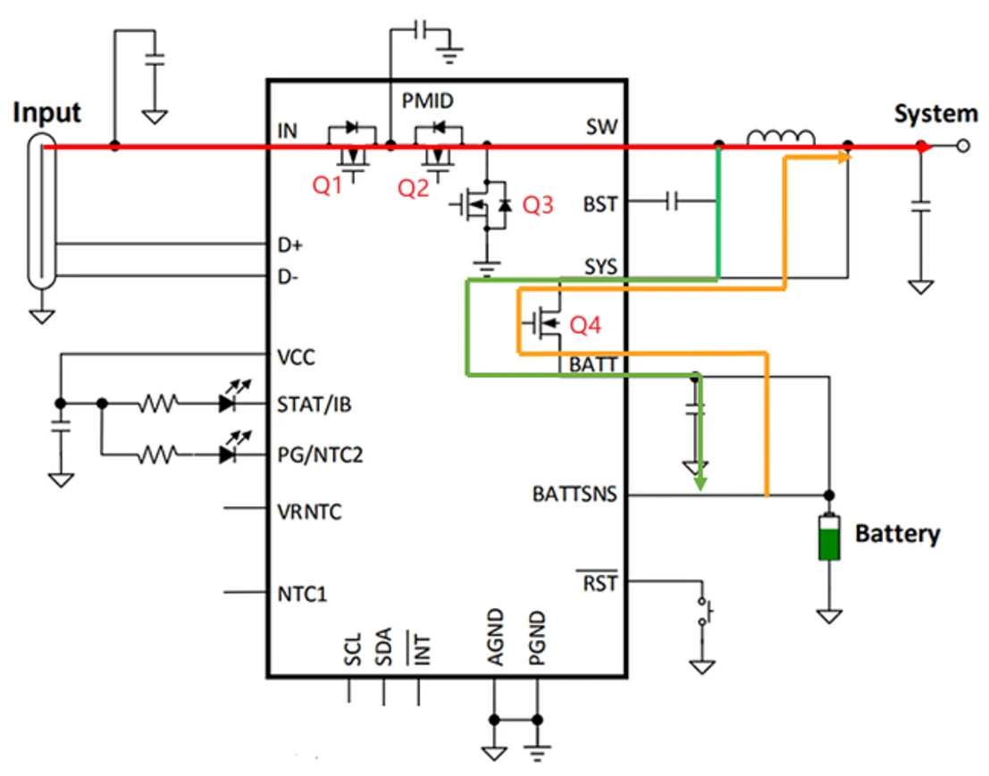 实现方案也很简单,在芯片内部集成了一个比较器,当系统电压VSYS因为抽载的原因跌落到电池电压以下时,BATFET(Q4管)就会重新打开。由于电池电压高于VSYS电压,电池将对外放电,即按照下图中橙色的箭头所示的路径参与对系统的供电,称为雪中送炭亦不为过。