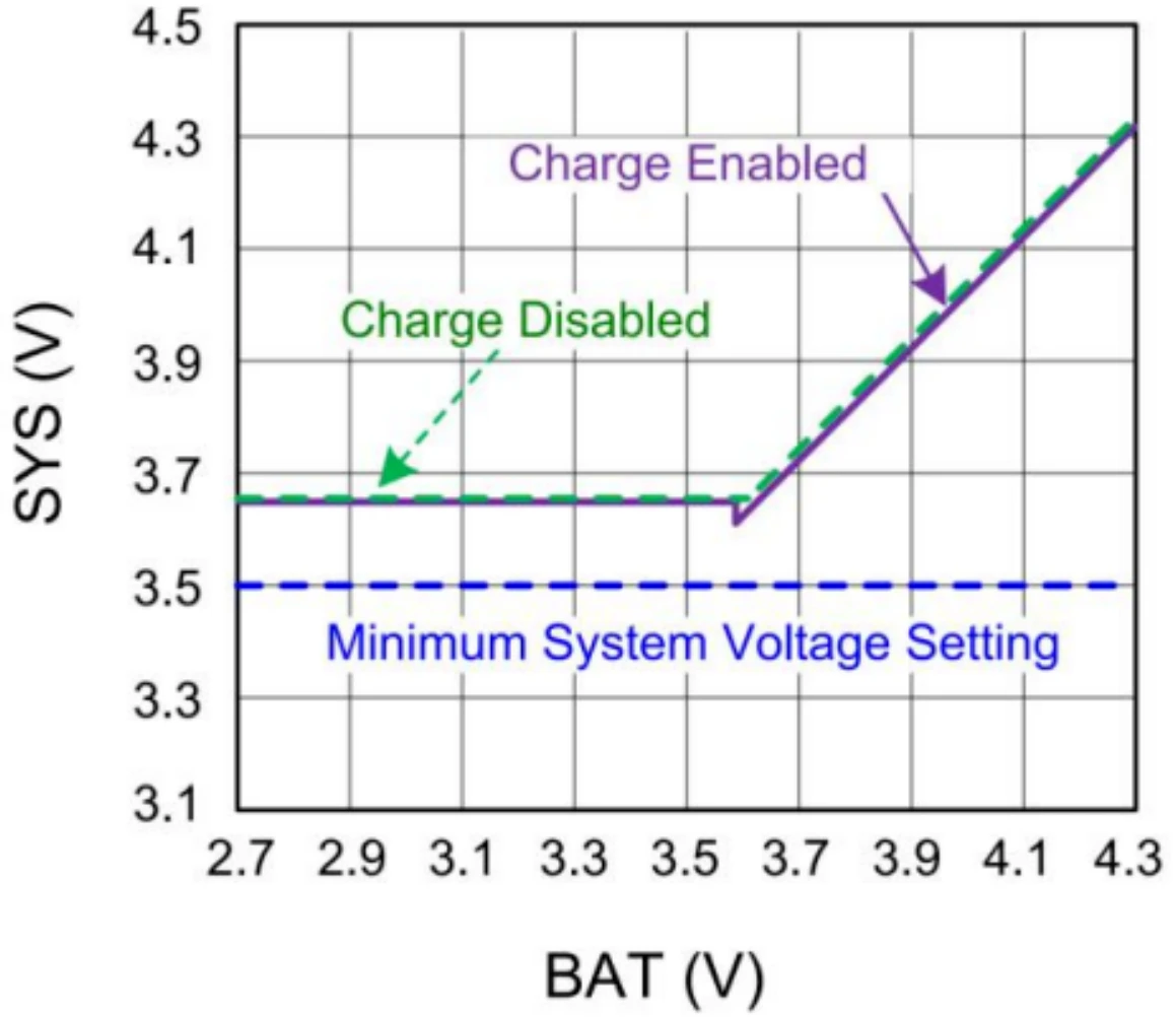如下图,如果VBAT低于设定的最小系统电压时,BATFET将会运行在线性模式(LDO mode),此时充电IC输出的Vsys电压将会比设定的最小系统电压高150mV;当VBAT上升到比最小系统电压高时,BATFET将完全导通(full on mode),此时充电IC输出的Vsys电压被调节在比电池电压高70mV左右的一个电压。