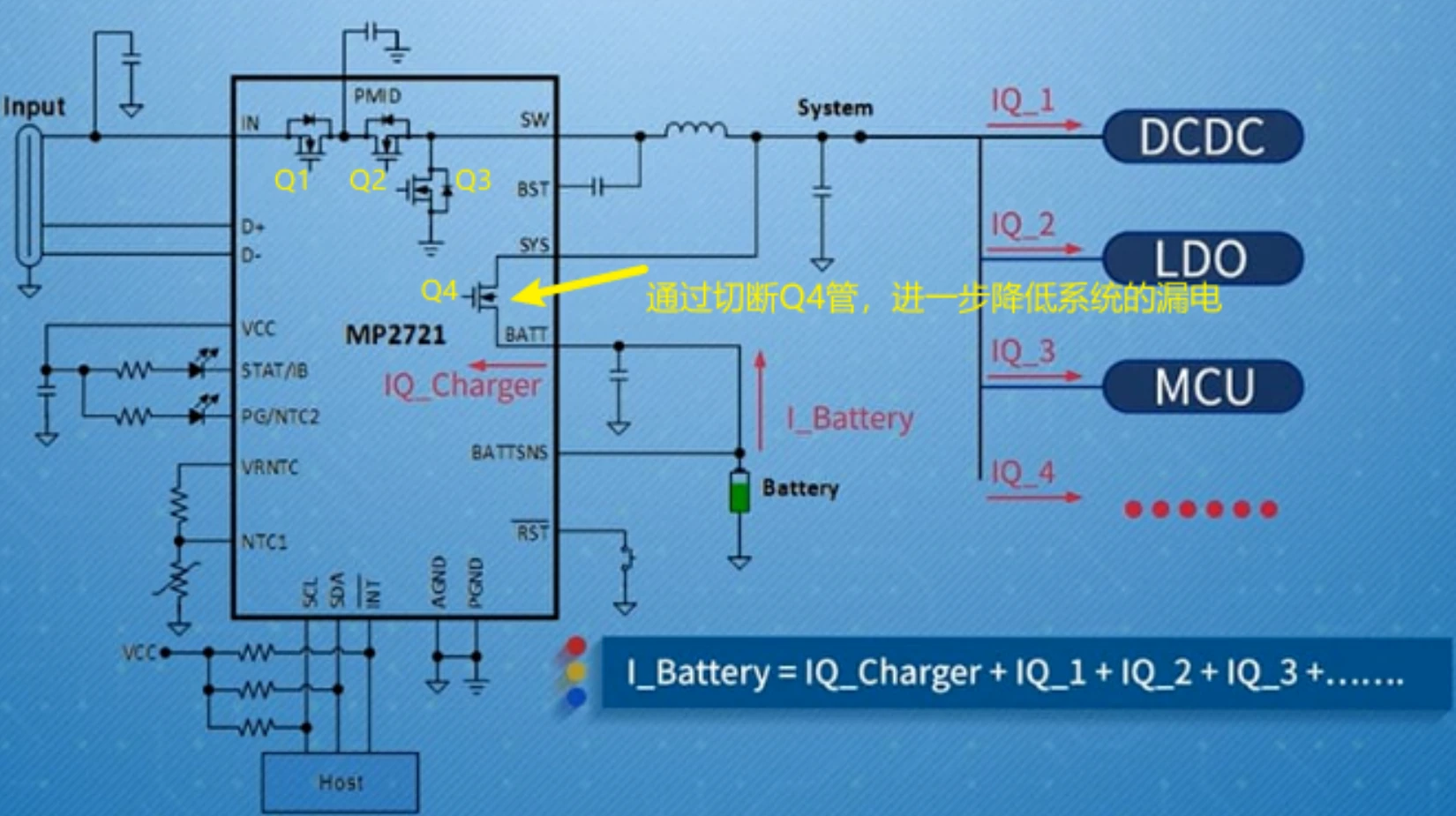 以MPS家的某buck charger IC为例,其未开启运输模式时待机功耗为44μA ,而开启运输模式后待机功耗只有8.5μA ,而这就是通过关断Q4管实现的。