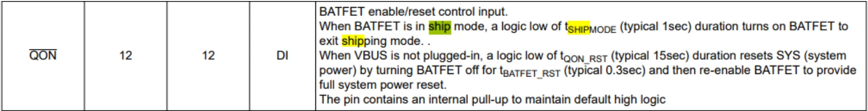 buck charger IC有个QON引脚,用于控制运输模式的退出,在手机电路上通常连接到开机键。这样用户第一次开机的动作就让手机退出运输模式了。此外,除了按开机键,我们插入充电器,也可以自动退出Ship Mode。