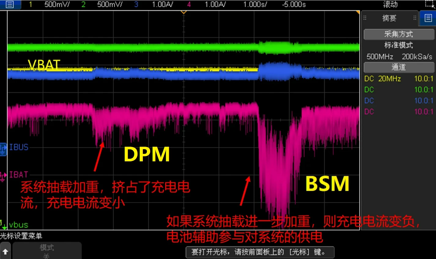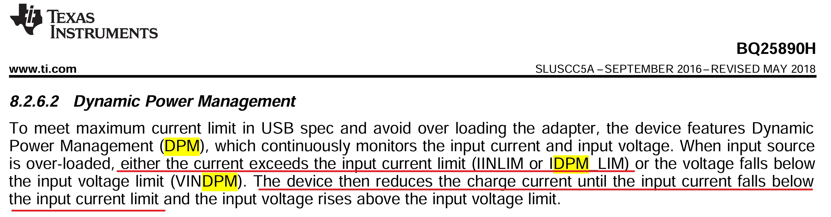 Pin = PSYS + PBAT,当系统抽载较大,导致IBUS电流达到ICL设定的限流值时,便触发DPM环路,此时进电池电流减少,直到IBUS小于ICL。外在表现为充电器优先为系统供电,不惜牺牲充电电流值。