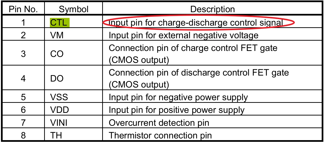 - 当CTL端子接低电平时,即可解除充放电禁止状态,CTL脚内部通常有下拉,正常状态下为低电平。