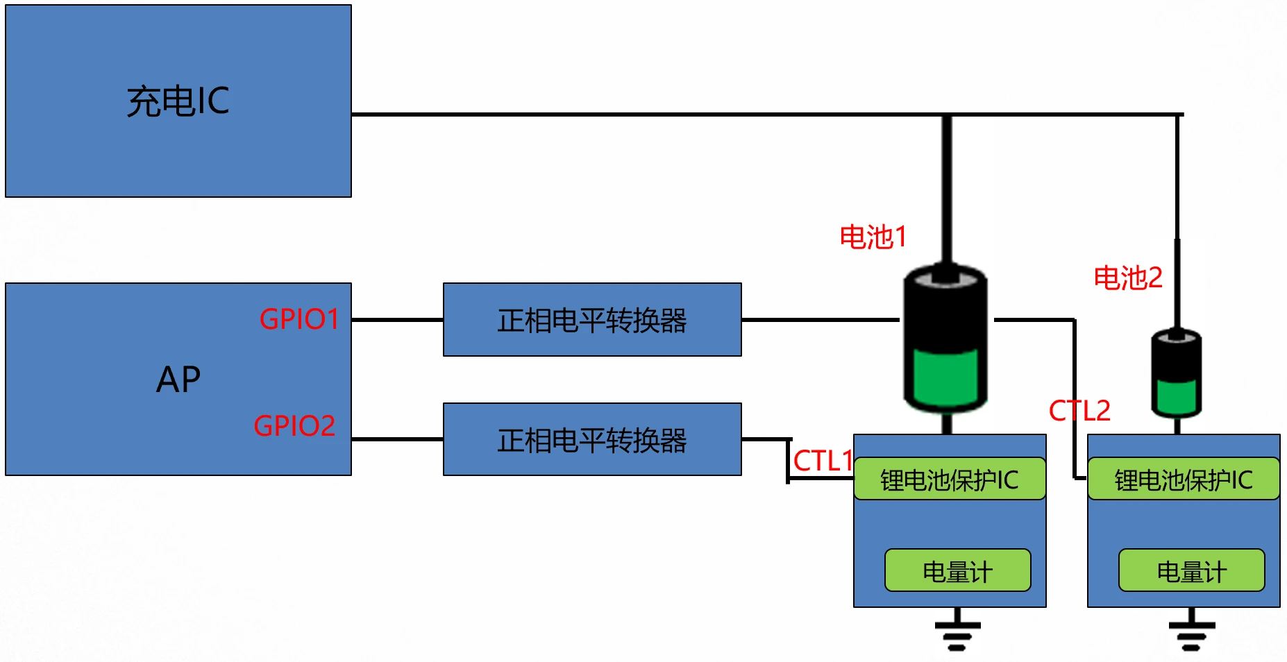 当一个电池充满后(通过电量计判断),该电池对应的GPIO拉高,然后信号经过电平转换器,给到锂电池保护IC的CTL脚,锂电池保护板上的充电MOS断开,充电通路由此被断开。