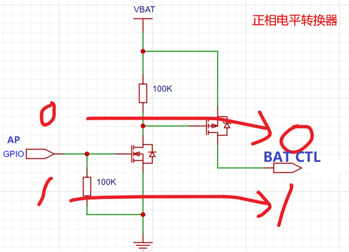 由于AP GPIO的高电平通常为1.8V,不适合电池的电源域(3.2~4.45V),故需要进行电平转换,电平转换电路如下所示: