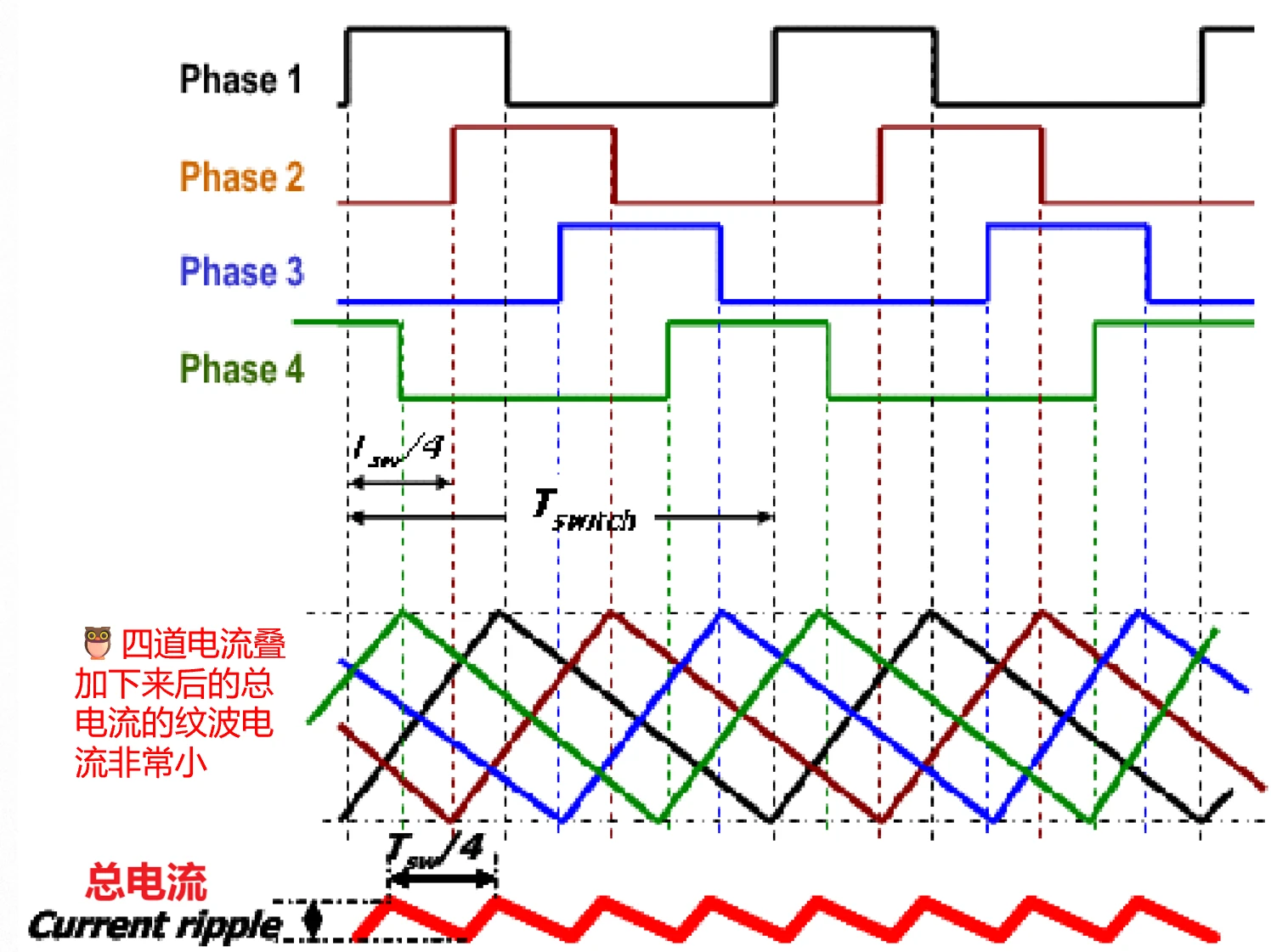 关键在于交错相位(Phase Interleaving),即它们的PWM控制信号是同频率但不同相位的。