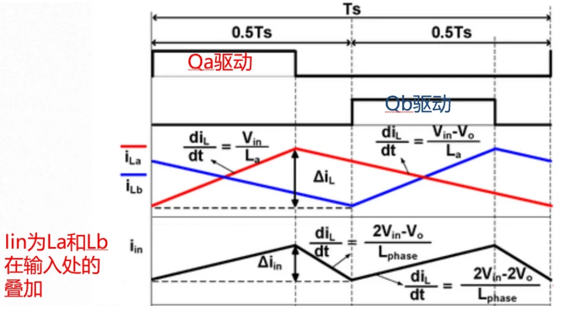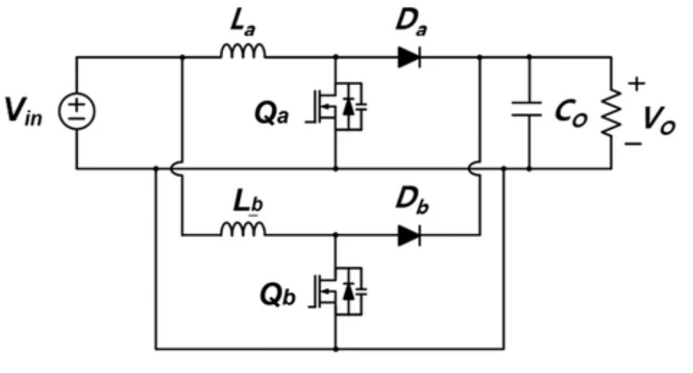 以两相交错为例,将两个完全相同的Boost变换器电路并联,共享同一个输入源和同一个输出电容负载。两个开关管Qa和Qb的驱动信号频率相同,但相位相差180度。