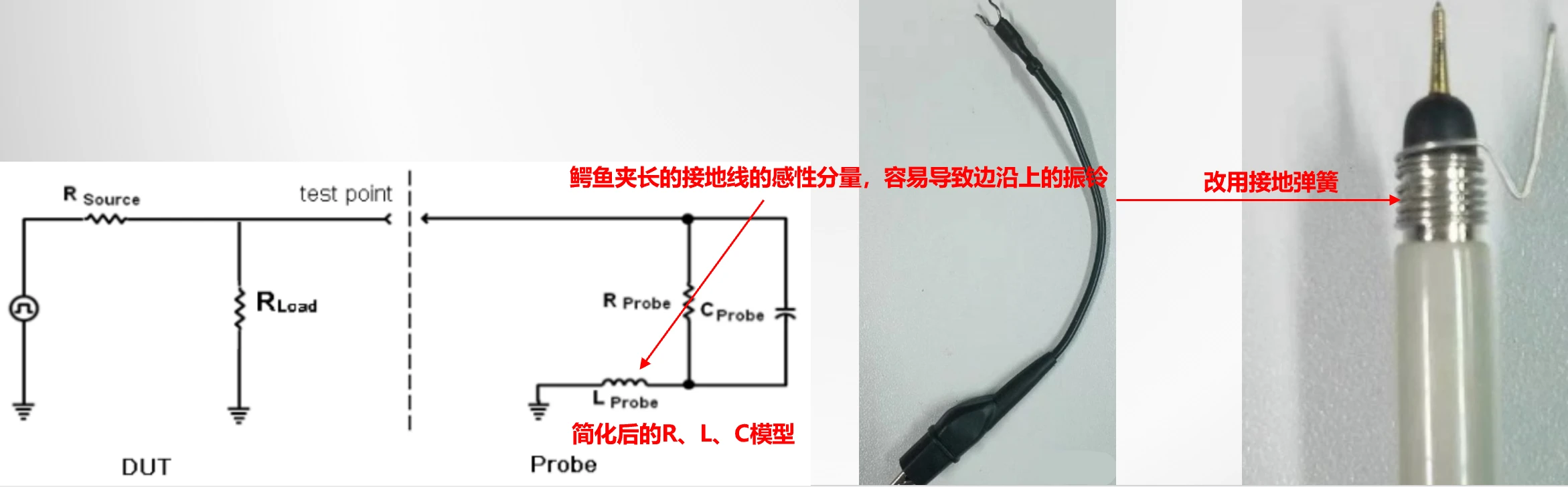 3、不要使用鳄鱼夹接地,而是使用接地弹簧。如果没有弹簧,可以自制接地线缠绕在探头地壳上。