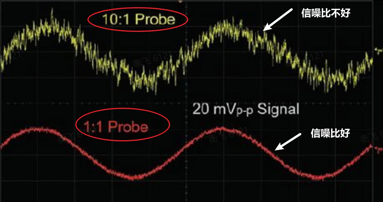 4、评估探头种类的影响,若探头为*10探头,其先缩小再放大的架构会降低信噪比,因为底噪也会被放大,看起来有点糊。所以*1探头要好于*10探头,50欧姆同轴线缆+隔直电容所做成的探头又好于*1探头。但根据实践经验来看,*10探头在手机电源测试中完全够用,*10探头也是最为方便获取的。