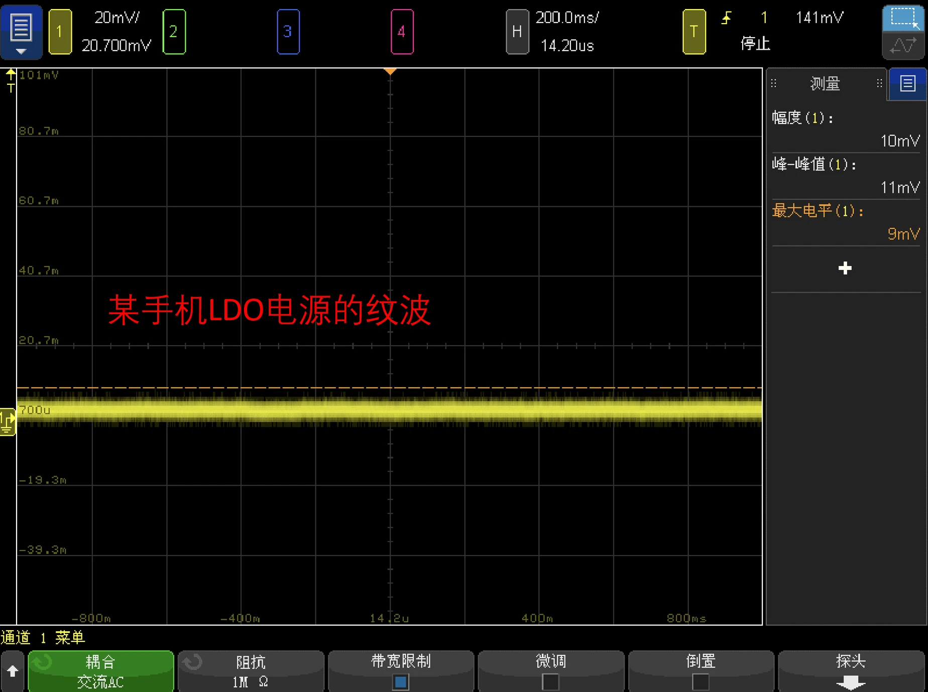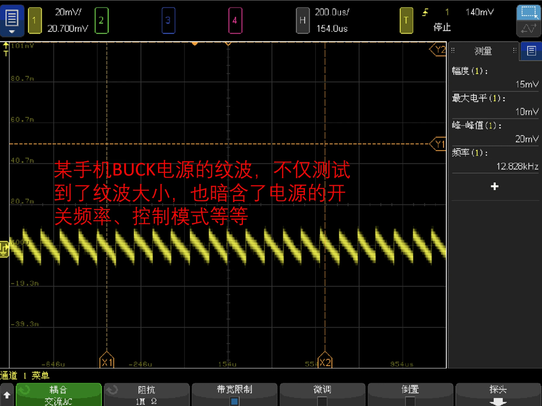 2、耦合方式选择为交流耦合,以便去掉直流电平,以更小的垂直档位(mV级)来仔细观测交流纹波,不关心直流电平。