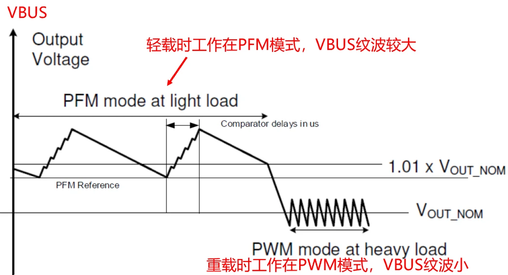 由此check到,是轻载时,Boost电路工作在PFM模式,VBUS纹波较大,开关频率不固定而且较低。而VBUS是数字耳机内部AD/DA的供电,VBUS的纹波成为了肇事者;而重载时,Boost工作在PWM模式,纹波小,开关频率是固定的而且较高,由此不构成人耳可听噪声。