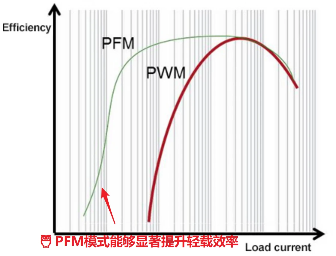 因此这是一个妥协,下图列举了PFM和PWM的效率对比示意图。