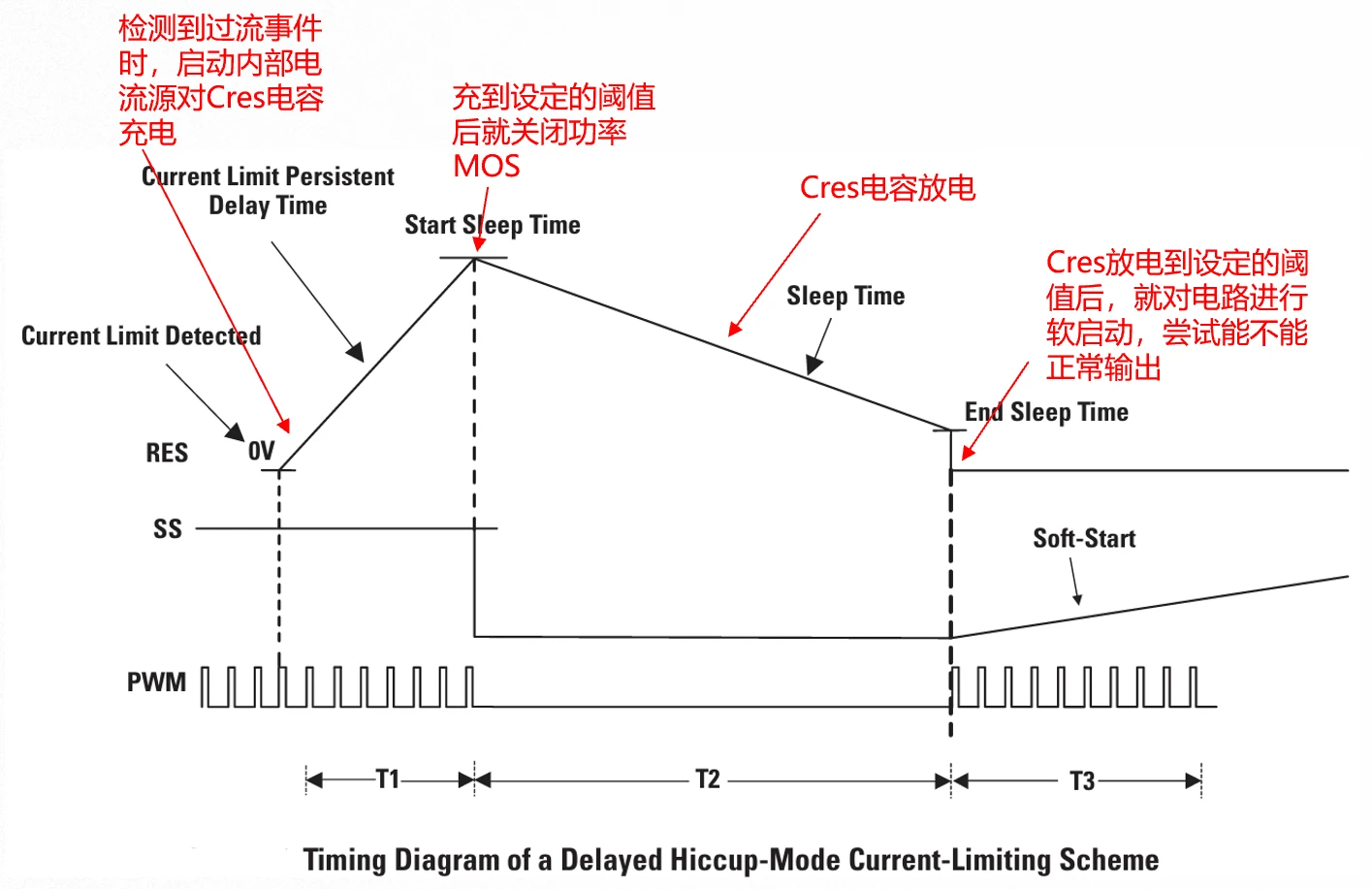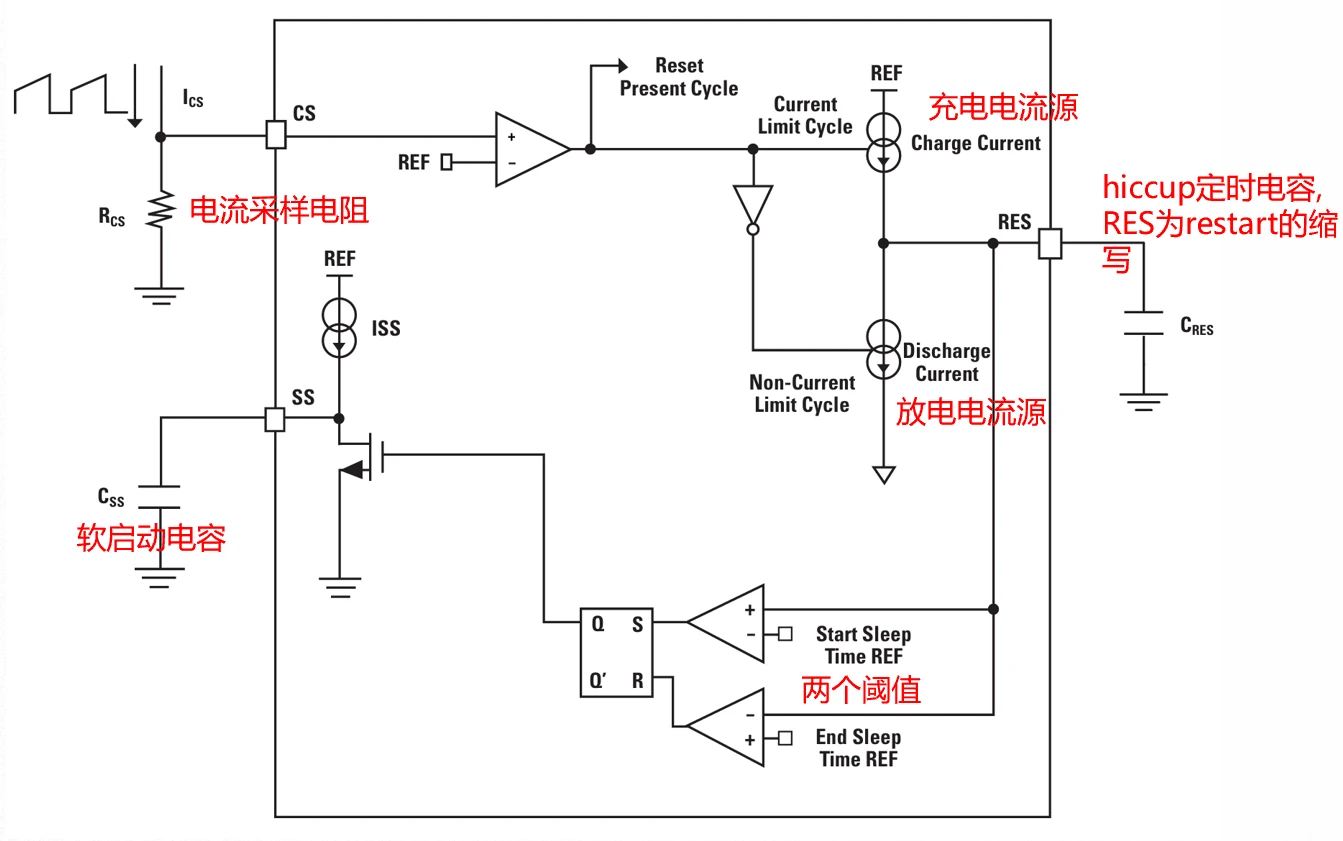 如下图,一旦检测到过载,便启动RES引脚内部的充电电流源对Cres充电,一旦维持时间达到T1,那么就会立刻关闭PWM驱动,芯片进入睡眠。随后,启动放电电流源对Cres放电,如果达到阈值(经历了T2时间),则睡眠结束,芯片软启动开始。软启动电路会尝试Vout端建立电压,如果短路形况消失则恢复正常输出;如果短路仍然存在,则芯片将再次进入睡眠模式。