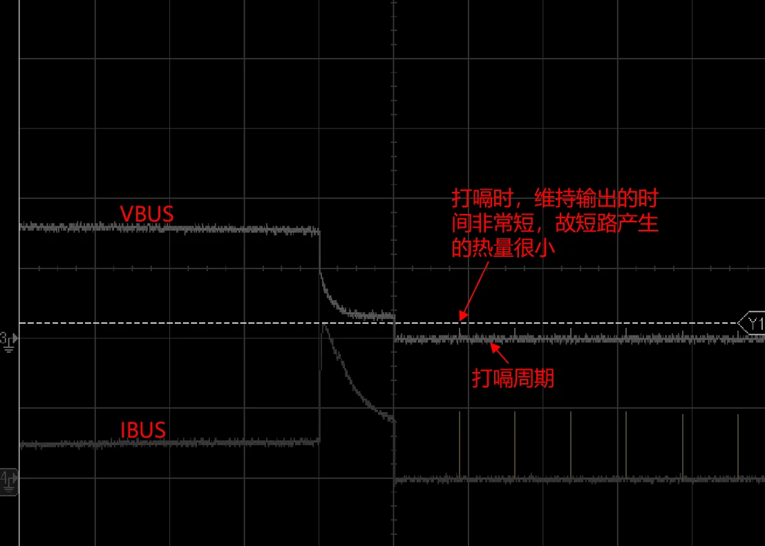 如下图所示,将充电器的VBUS对地短路,可以看到打嗝表现,为典型的“尝试-失败-休息-再尝试”的循环策略。