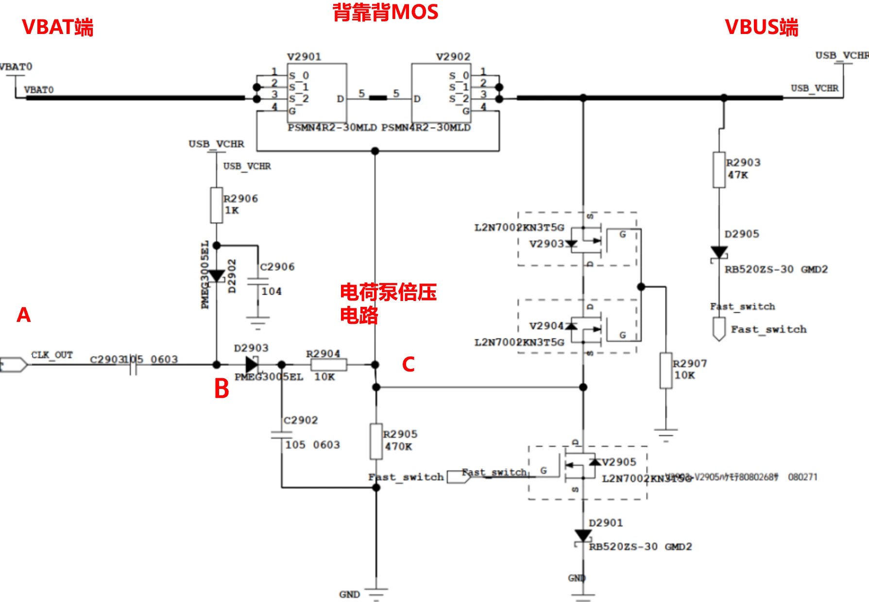 方波为低时,USB_VCHR通过R2906、D2902给C2903充电,将C2903两端电压约充到VBUS;方波为高电平时,因为C2903电容两端电压不能突变,导致B点电压抬升,约抬升至VBUS+VBAT的电压。
