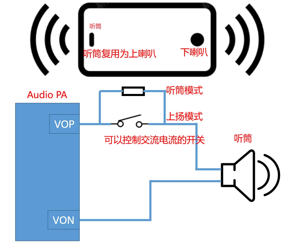 有的厂商用一个背靠背MOS开关做路径切换,如下图,外放模式(上扬)直接走开关,听筒模式则串联一个数十欧姆的电阻,人为地增大阻抗,降低电流,声音做小。