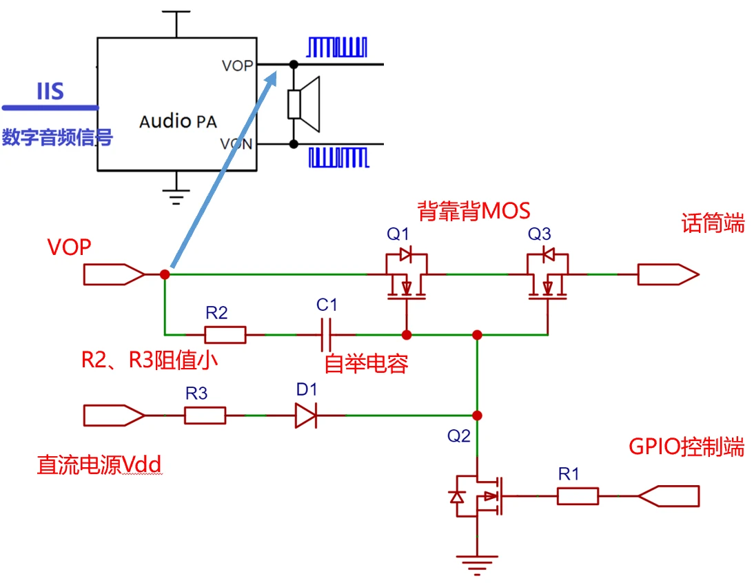 因为听筒上跑的是交流信号,若只是选取一个MOS,因MOS上寄生二极管的存在,对于交流信号的关断就会失效,所以要选择两个MOS构成背靠背MOS开关。