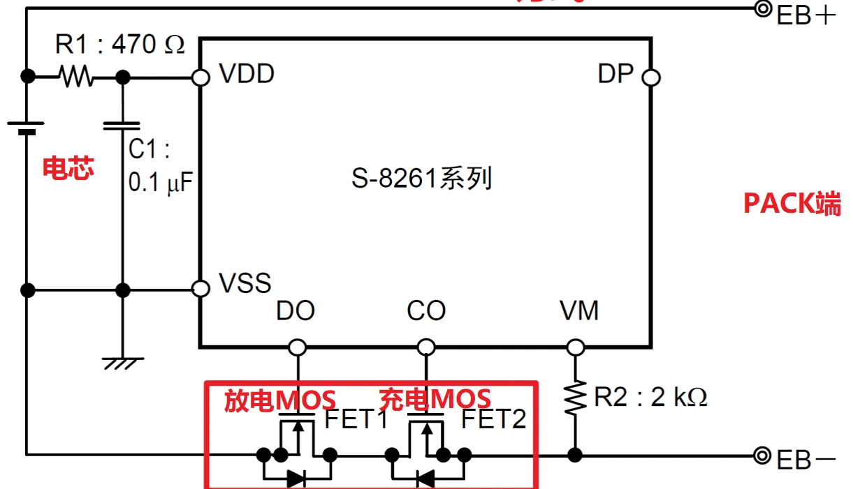 还有电池保护板上的电路,如下图,电池保护板上的充电MOS和放电MOS,虽然属于背靠背结构,但需要说明的是,它们的驱动脚(栅极)没有连在一起,导通/关断行为不同步,与上面所讲述的背靠背有差异。