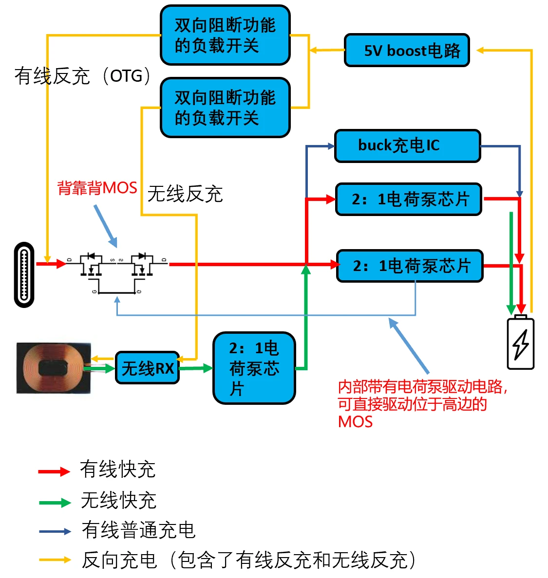利用背靠背MOS,可以防止有线充输入和无线充输入互灌。举例某款老手机架构如下图,当背靠背MOS关断时,左右两端是无法形成通路的,从而阻止互灌。
