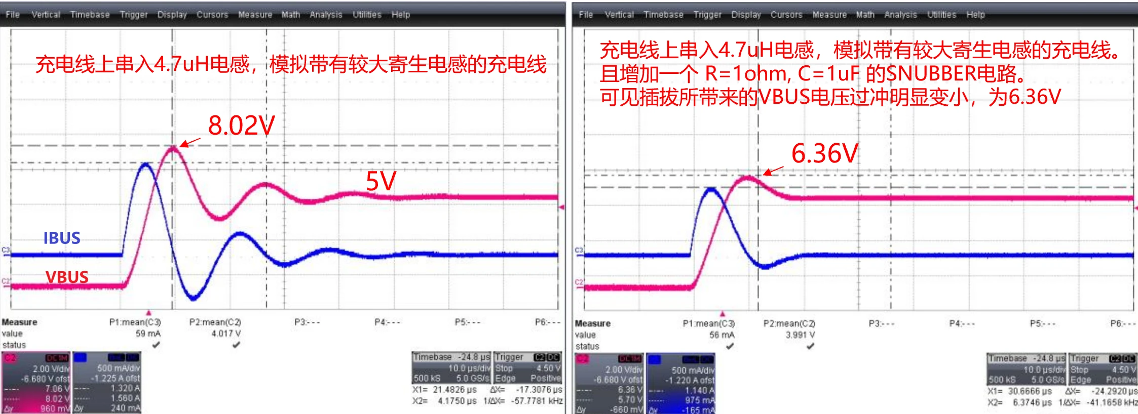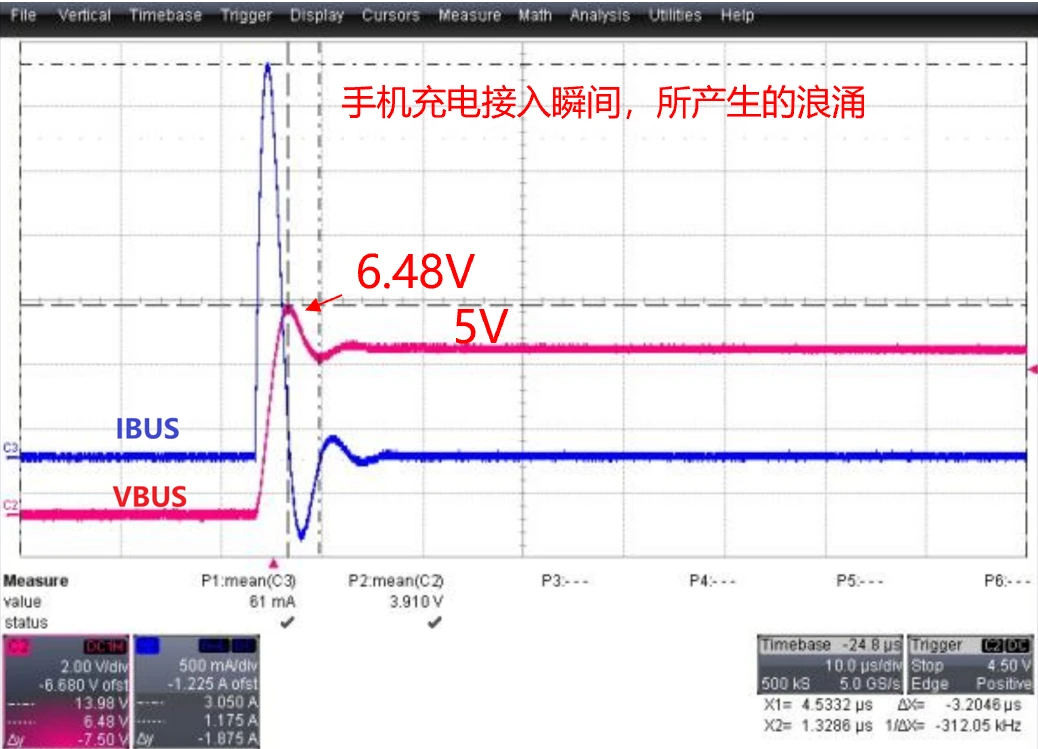 在Type-C口热插拔的过程中,手机端的VBUS通常会出现浪涌,波形实例如下图。