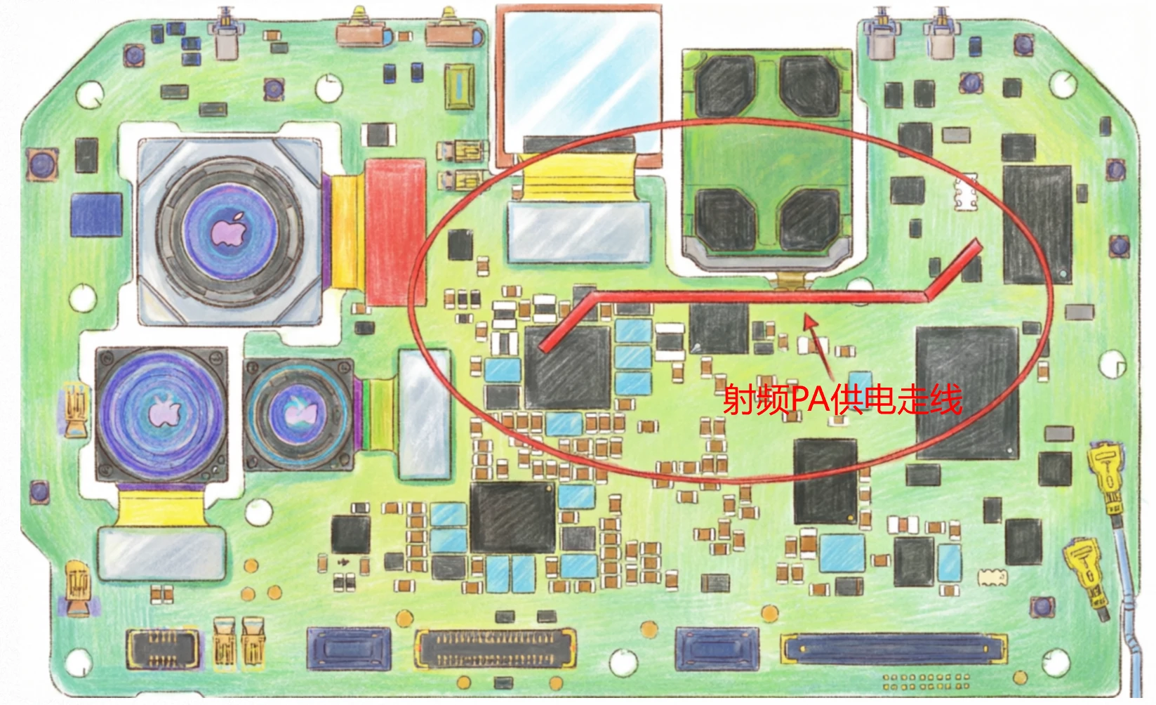 顺藤摸瓜,排查PCB走线,发现4G PA的供电走线像公交车上喜欢贴贴的痴汉一样,极为靠近听筒。怀疑是该走线上的瞬态电流变化产生磁干扰,辐射到听筒本体,然后在听筒本体的线圈上生成感应电流,再在听筒内部永磁体的磁场作用下振动,由此产生噪声。