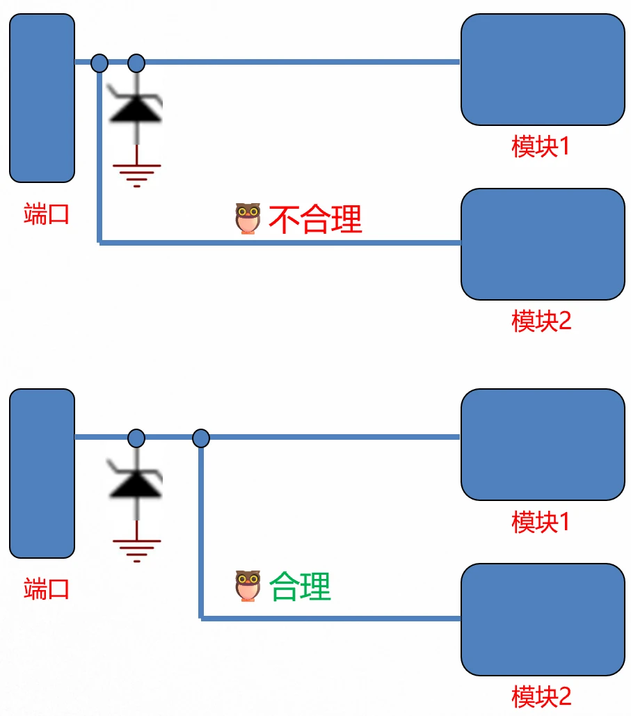 这是一个典型的负面例子,TVS一定要靠近端口放置,否则它就不钳位。基本上每个公司都有相关checklist,这种checklist不是空穴来风,在设计中一定要坚守!这样才能确保瞬态能量第一时间被TVS引导到地,形成最短的泄放路径。