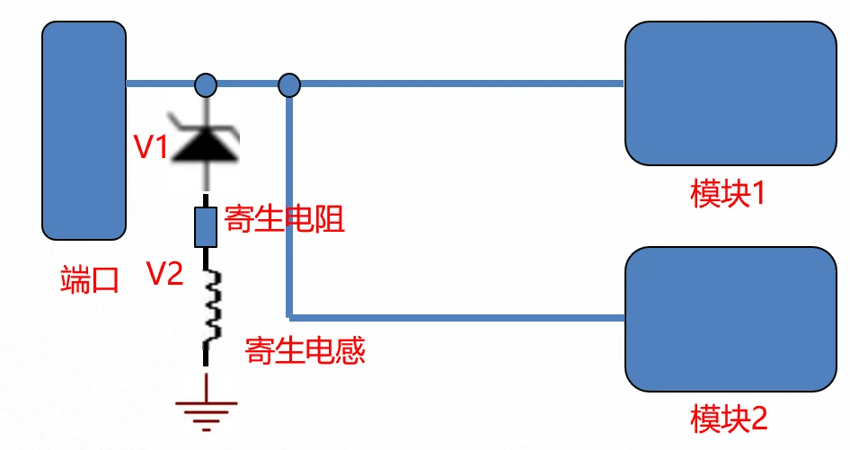 如下图,浪涌能量经过TVS产生一个钳位电压V1,然后再流经寄生参数产生压降V2,后端电路看到的残压便是V1 + V2。寄生参数实实在在地增加了V2的残压,容易对一些耐压值较差、容差范围大的器件产生影响。