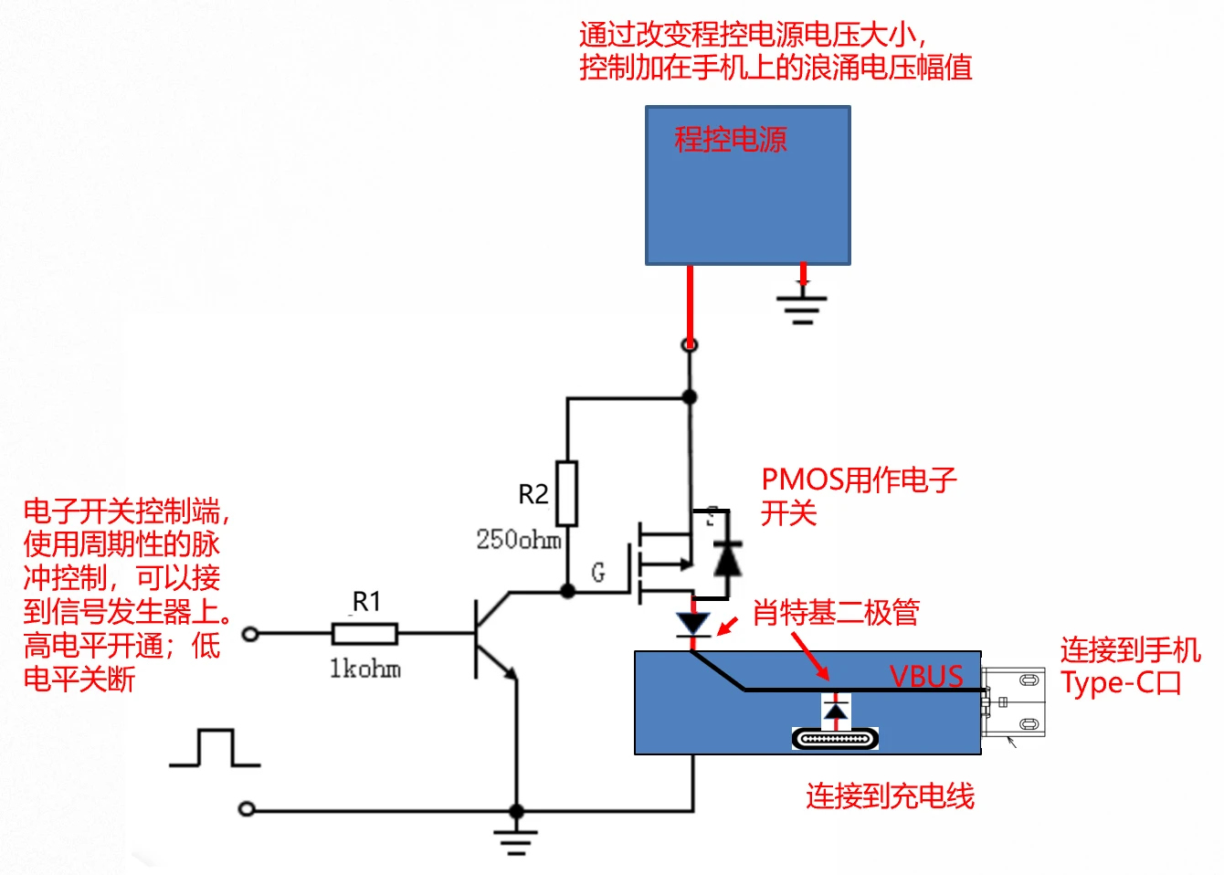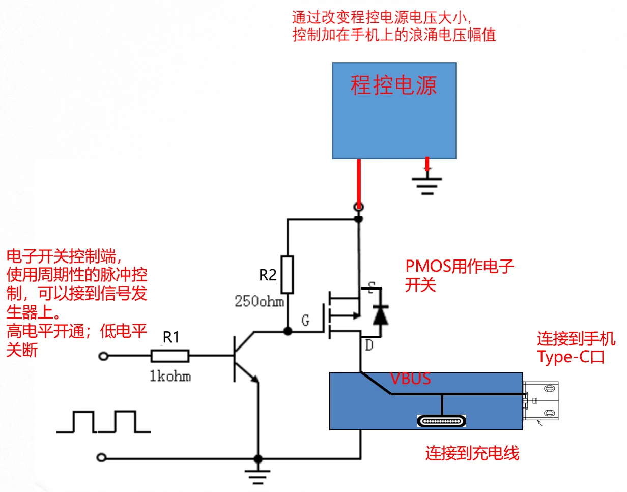 - 该开关接到程控电源上,由程控电源提供浪涌能量,改变程控电源大小,即可控制加在手机VBUS端口的浪涌电压幅值;