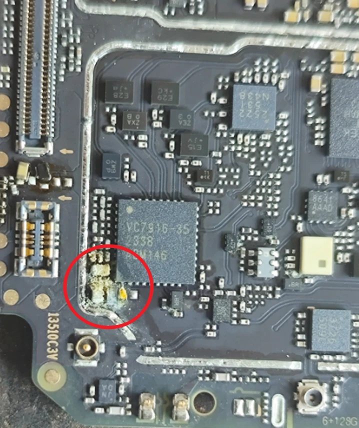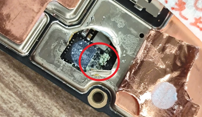 进液后,因为手机PCB板上带电,液体在PCB板上发生电化学腐蚀,肉眼可见的冒泡,发出滋滋声,生成浑浊的腐蚀物,像是煲汤一样。随后导致短路,烧毁、芯片击穿等灾难性损坏。事后很难修好,让人头大。