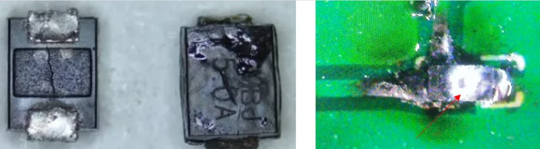 我们都知道TVS的核心作用是钳位,当瞬间过电压超过其击穿电压时,它会迅速从高阻态变为低阻态,将大电流泄放到地,从而保护后端电路。但如果这个瞬态能量超过了TVS本身能承受的极限,它会因发热而烧毁,有时也能在外表看到烧蚀的痕迹,如下图。但失效后的表现是什么样的呢?是短路还是开路?