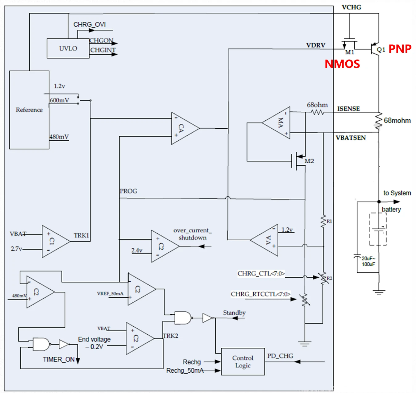 在恒流充电时,PNP工作在线性放大状态,此时控制电流ICTRL和ICHG的关系为:ICHG = β*ICTRL。β就是PNP的电流放大系数。
