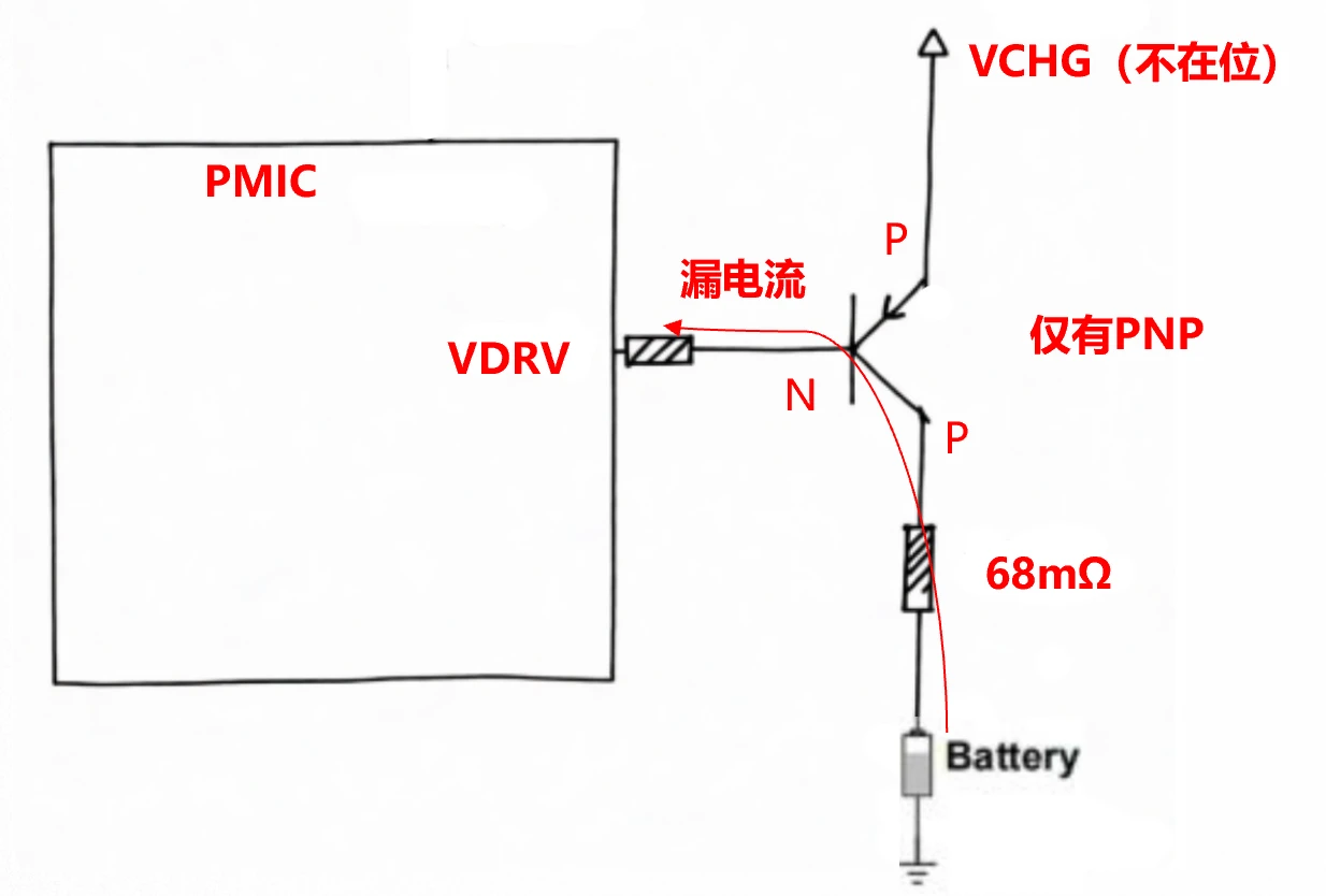 如下图,如果没有NMOS,当不充电的时候,VBAT会通过PNP的c极,往VDRV管脚漏电,这个漏电在待机、甚至关机状态下都可能存在,影响待机时长,而加上一个NMOS管可以阻断这种漏电。