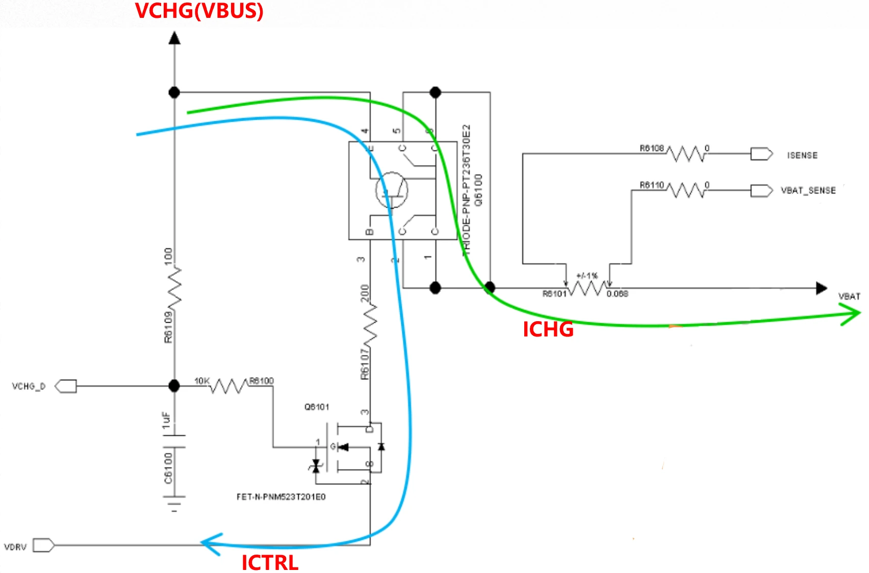 蓝色路径ICTRL是控制路径,流经PNP的e极、b极,然后经过NMOS的D极和S极,连接至PMIC的VDRV管脚。通过控制进入VDRV的电流,来控制充电电流的大小。