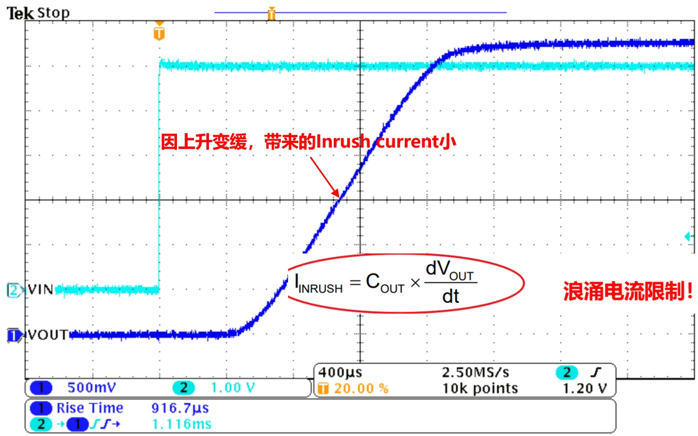- 缓启动(soft start): 浪涌电流就像是起床气,而通过控制MOS的开启速度,使输出电压平缓上升,可以防止在开启瞬间产生大的浪涌电流,避免输入电压跌落、系统复位。